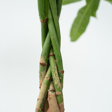 Mit ihren großen Blättern und den fein geflochtenen Stämmen ist die Pachira eine schöne und außergewöhnliche Pflanze. Die Pachira entwickelt einen relativ dünnen, flexiblen Stamm, der verflochten werden kann. In Ostasien gilt sie gemäß der Feng-Shui-Lehre als Symbol für Wohlstand und Glück im Haus. Die fünf Blätter an jedem Zweig stehen für die fünf Elemente des Feng Shui: Metall, Holz, Wasser, Feuer und Erde. Die Pachira ist auch unter vielen anderen Namen bekannt, zum Beispiel als Wasser-Kakao oder Geldbaum. Ihren Namen verdankt sie dem Glauben, dass die Blätter Geld "fangen" können. Dadurch ist sie ein ideales Geschenk zum Geburtstag, Einzug oder zur Hochzeit. Die Pachira ist eine echte tropische Pflanze, die ursprünglich aus den Sümpfen von Ostbrasilien, Panama und Costa Rica stammt, wo sie bis zu 20 Meter hoch wird. Für Menschen, die ihre Pflanzen manchmal vergessen, ist die Pachira ideal, da sie keine großen Ansprüche stellt. Und der geflochtene Stiel verleiht der Pachira einen ganz besonderen Look! Die Pachira mag einen hellen Standort und nicht zu nah am Fenster. Da er Wasser in seinem Stamm speichert, muss der Boden trocken sein, bevor er erneut gegossen wird. Im Winter wird die Pflanze gerne gegossen, das beugt Blattverlust vor und regt die Bildung neuer Blätter an. Alte Blätter können ruhig herausgeschnitten werden. Im Sommer muss die Pflanze etwa zweimal pro Woche gegossen werden.