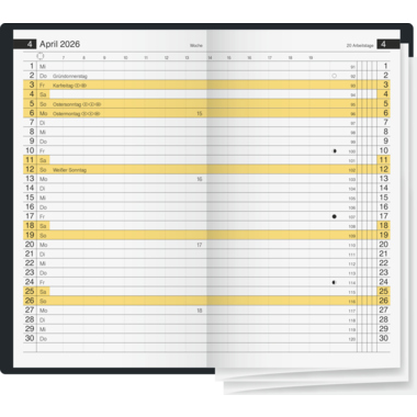 - Kalenderaufteilung: 1 Monat/2 Seiten